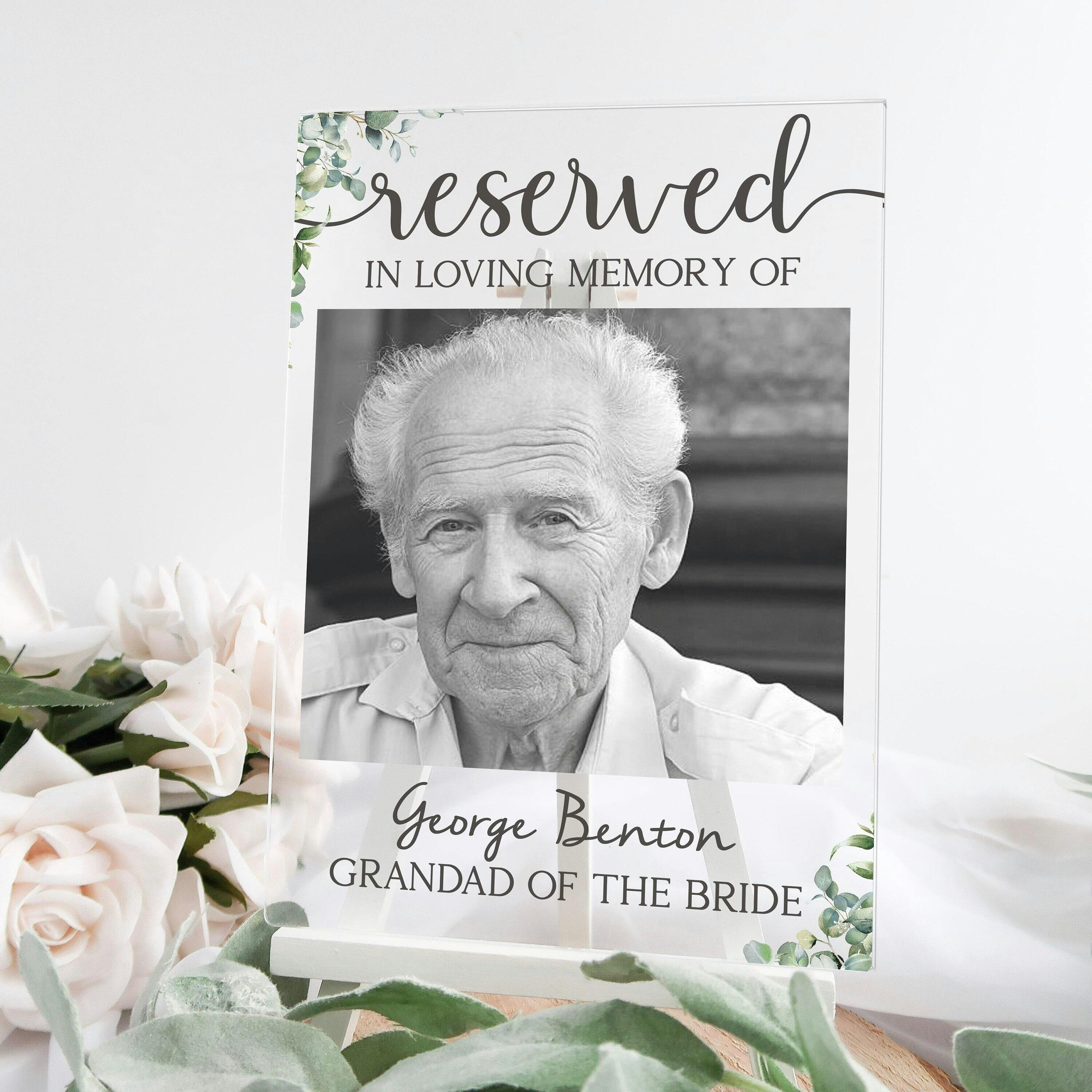 Looking for a way to remember loved ones who have passed on your wedding day? Look no further than our 'In Loving Memory' personalised wedding sign. Featuring your most favourite photo, we will UV print directly onto the acrylic, ready to placed on a chair at your wedding or, on your memorial table.